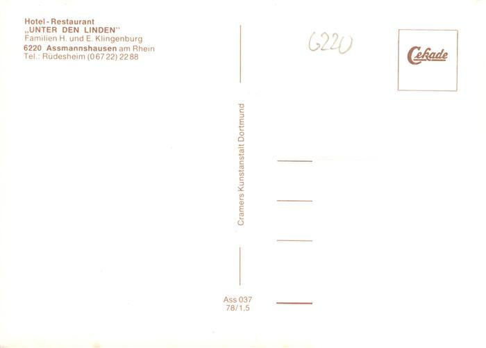 73936534 Assmannshausen Rhein Hotel Restaurant Unter den Linden postalisch nicht gelaufen Erhaltung siehe scans [FriedD77] KatCode: 11110006439013