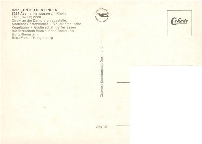 73923714 Assmannshausen Rhein Hotel Unter den Linden postalisch nicht gelaufen Erhaltung siehe scans [WerneD78] KatCode: 11110006439013