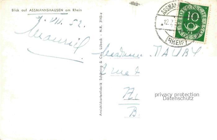 74095496 alte Postkarte AssMANNSHAUSEN Rhein Panorama Blick ueber den Rhein postalisch gelaufen Erhaltung siehe scans [FriedD77] KatCode: 11110006439013