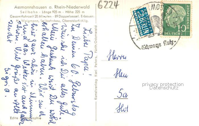 73696545 alte Postkarte Assmannshausen Seilbahn Blick ins Tal Rheintal Weinberge postalisch gelaufen Erhaltung siehe scans [FriedD77] KatCode: 11110006439013