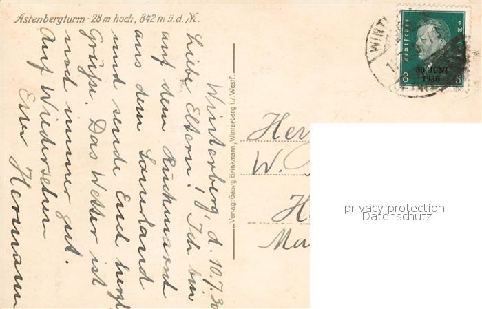 73809352 alte Postkarte Astenberg Schmallenberg Astenbergturm postalisch gelaufen Erhaltung siehe scans [WerneD78] KatCode: 11110005958040