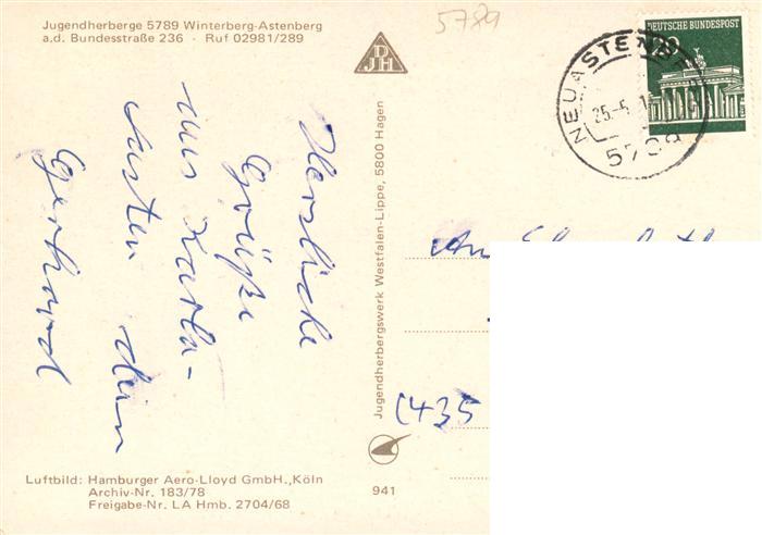 73886885 alte Postkarte Astenberg Schmallenberg Jugendherberge Fliegeraufnahme postalisch gelaufen Erhaltung siehe scans [WerneD78] KatCode: 11110005958040