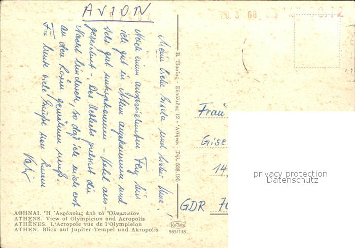 old postcard Athen Griechenland Jupiter-Tempel Akropolis postalisch gelaufen Erhaltung siehe scans