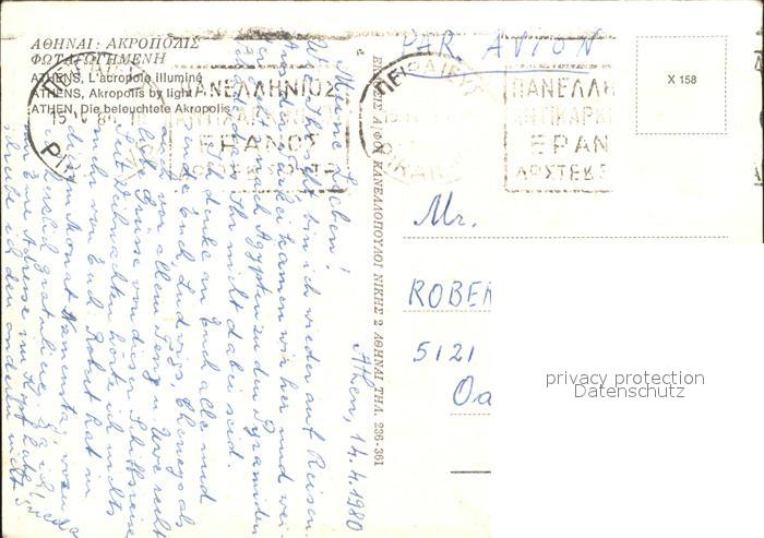 old postcard Athenes Athen Akropolis beleuchtet bei Nacht Tempel Antike postalisch gelaufen Erhaltung siehe scans