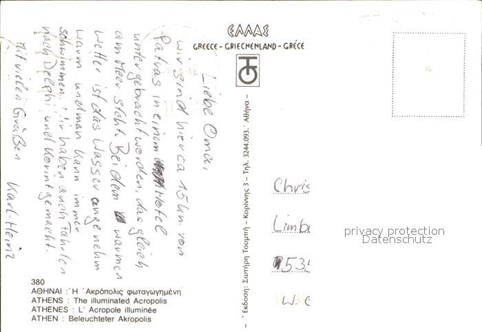 Athenes Athen Akropolis beleuchtet bei Nacht Tempel Ruine Antike postalisch nicht gelaufen Erhaltung siehe scans
