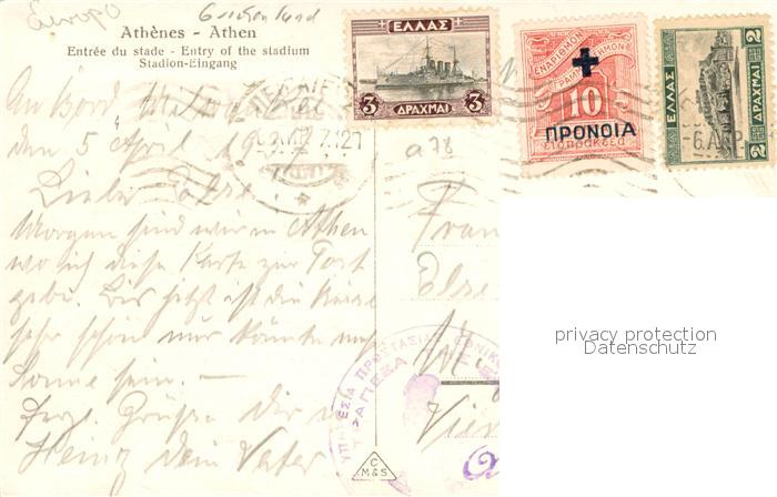 33708537 old postcard Athenes Athen Entree du stade Entry of the stadium postalisch gelaufen Erhaltung siehe scans [WerneD78] KatCode: 11190