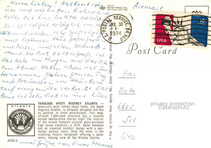 72850609 old postcard Atlanta Georgia Hotel Hyatt postalisch gelaufen Erhaltung siehe scans [AndreD76] KatCode: 14140120000000