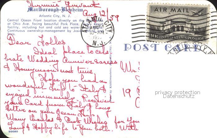 72278203 old postcard Atlantic City New Jersey Marlborough Blenheim Hotel Park Place postalisch gelaufen Erhaltung siehe scans KatCode: 14140320000000
