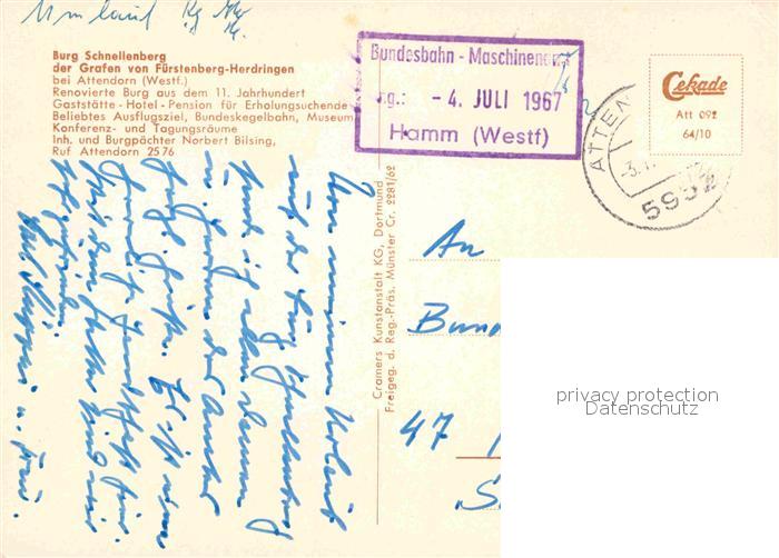 72878750 alte Postkarte Attendorn Burg Schnellenberg der Grafen von Fuerstenberg Herdringen Fliegeraufnahme postalisch gelaufen Erhaltung siehe scans [FriedD77] KatCode: 11110005966004