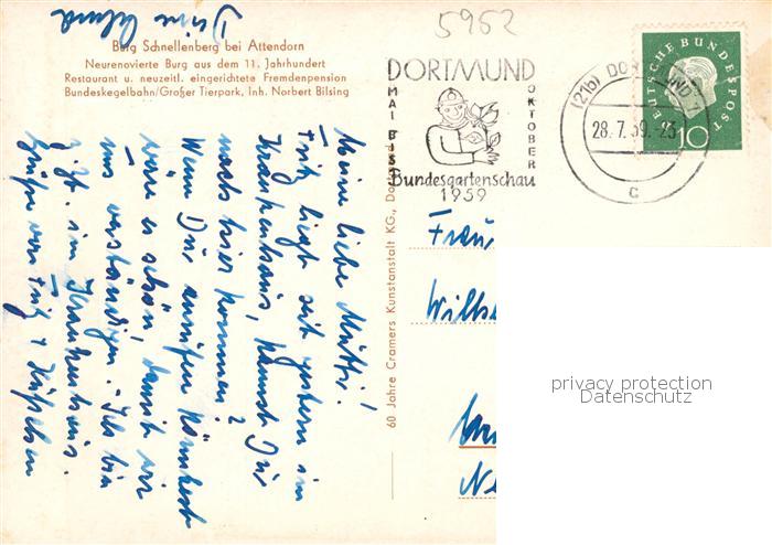 73866243 alte Postkarte Attendorn Burg Schnellenberg Restaurant postalisch gelaufen Erhaltung siehe scans [WerneD78] KatCode: 11110005966004