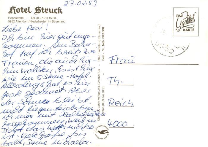 73880706 alte Postkarte Attendorn Hotel Struck Kaminzimmer Kegelbahn Hallenbad postalisch gelaufen Erhaltung siehe scans [FriedD77] KatCode: 11110005966004