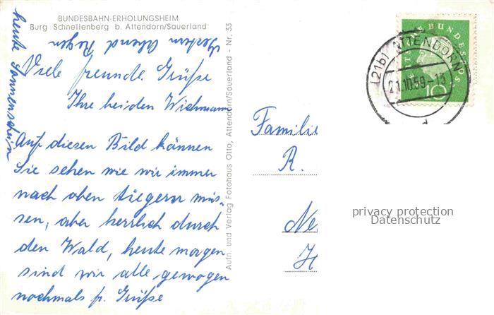 74150856 alte Postkarte Attendorn OLPE NRW Bundesbahn-Erholungsheim Burg-Schnettenberg Sauerland Waldlage Burganlage Fichten postalisch gelaufen Erhaltung siehe scans [Karloger] KatCode: 11110005966004