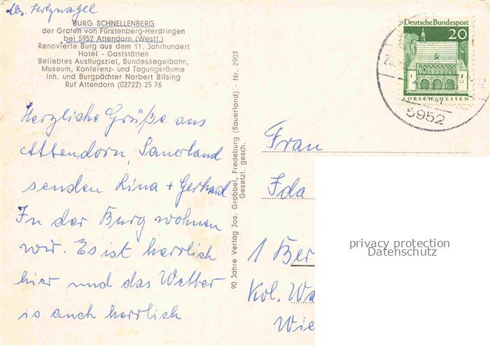 74110158 alte Postkarte Attendorn OLPE NRW Burghotel Schnellenberg postalisch gelaufen Erhaltung siehe scans [IrynaD87] KatCode: 11110005966004