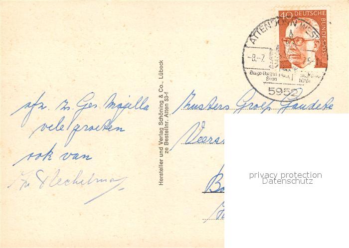 73306507 alte Postkarte Attendorn Panorama Burg Schnellenberg Rathausplatz Bigge Talsperre Waldenburgkapelle postalisch gelaufen Erhaltung siehe scans [WerneD78] KatCode: 11110005966004