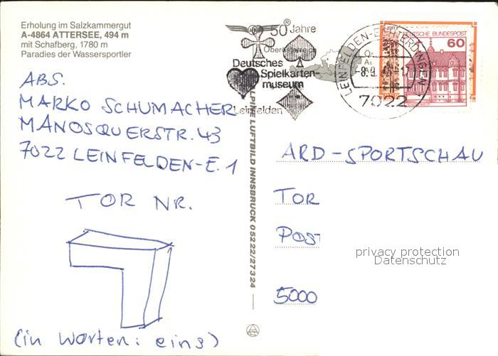 72425173 alte Postkarte Attersee mit Schafberg Fliegeraufnahme postalisch gelaufen Erhaltung siehe scans KatCode: 11390315041702