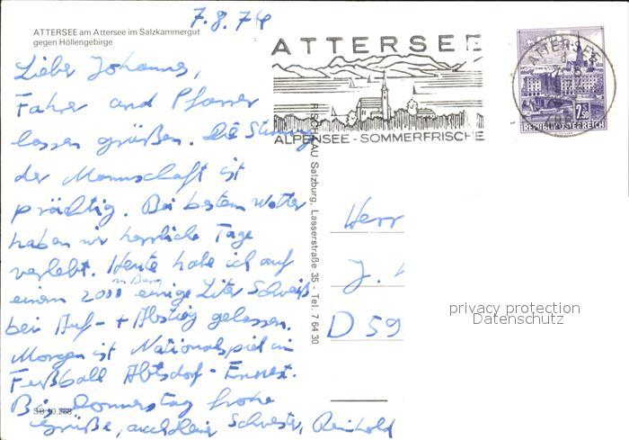 72451849 alte Postkarte Attersee Ortsansicht mit Kirche Blick gegen Hoellengebirge postalisch gelaufen Erhaltung siehe scans KatCode: 11390315041702