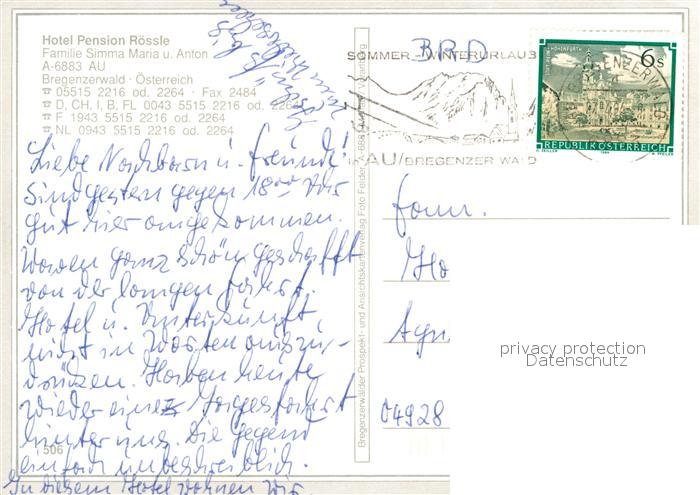 73028962 alte Postkarte Au Bregenzerwald Hotel Pension Roessle postalisch gelaufen Erhaltung siehe scans [PaolaD17] KatCode: 11390341080233
