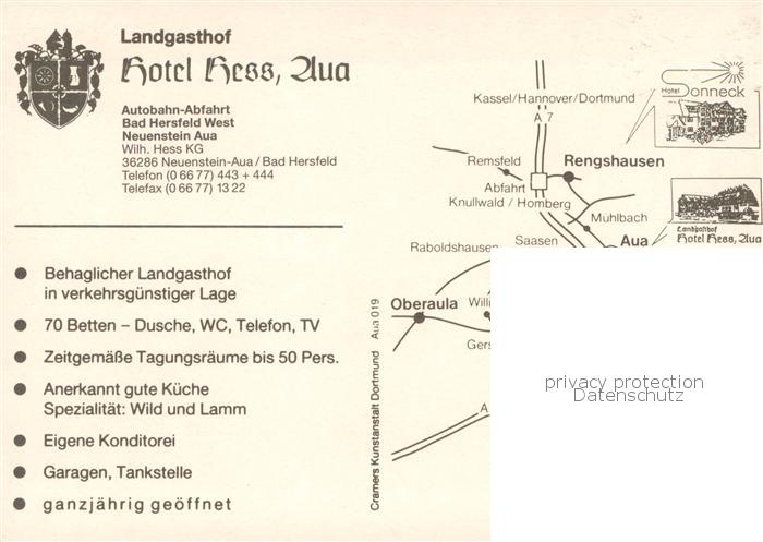 73759855 Aua Landgasthof Hotel Hess Gastraeume postalisch nicht gelaufen Werbekarte (keine Postkarte) Erhaltung siehe scans [FriedD77] KatCode: 11110006632014