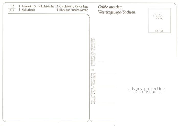 73232503 Aue Erzgebirge Altmarkt Nikolaikirche Kulturhaus Carolateich Parkanlage Friedenskirche postalisch nicht gelaufen Erhaltung siehe scans [KathaD81] KatCode: 11110014191040