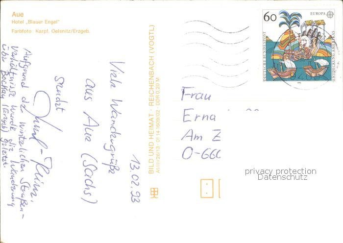 72071074 alte Postkarte Aue Erzgebirge Hotel Blauer Engel postalisch gelaufen Erhaltung siehe scans KatCode: 11110014191040
