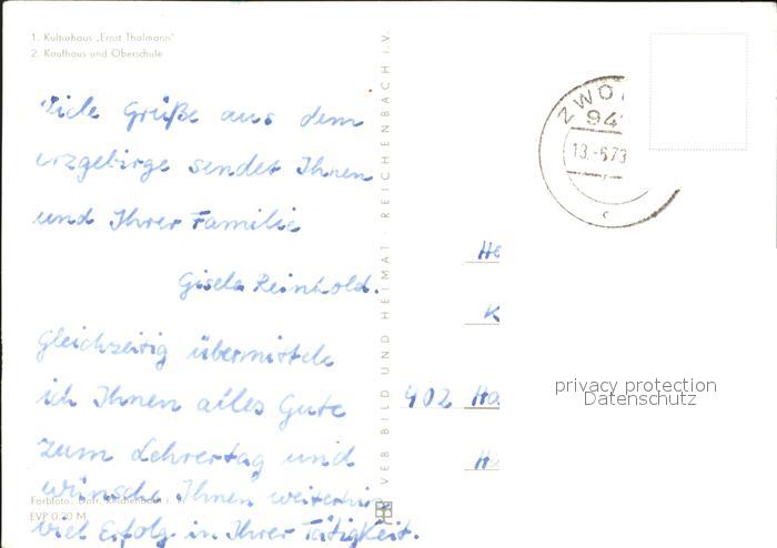 72326099 alte Postkarte Aue Erzgebirge Panorama Kulturhaus Ernst Thaelmann Kaufhaus und Oberschule postalisch gelaufen Erhaltung siehe scans KatCode: 11110014191040