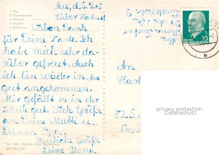 73652393 alte Postkarte Aue Erzgebirge Post Altmarkt Stadion Kulturhaus Gesamtansicht postalisch gelaufen Erhaltung siehe scans [FriedD77] KatCode: 11110014191040