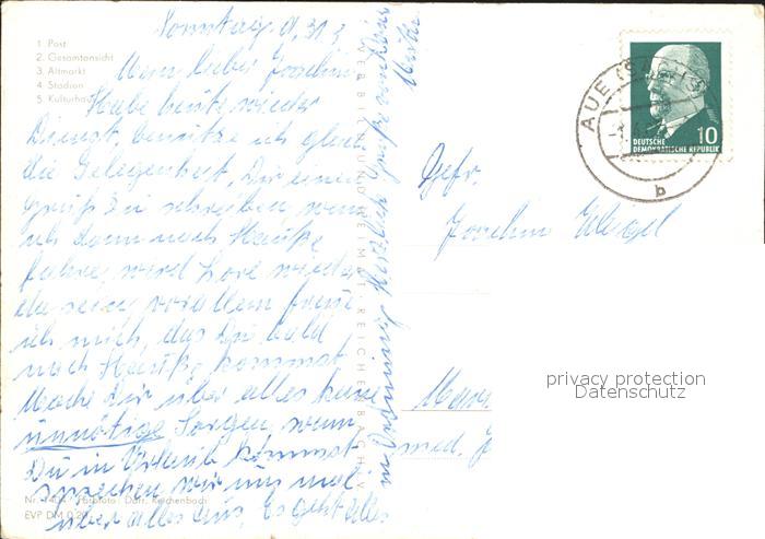 72382772 alte Postkarte Aue Sachsen Post Altmarkt Stadion postalisch gelaufen Erhaltung siehe scans KatCode: 11110014191040