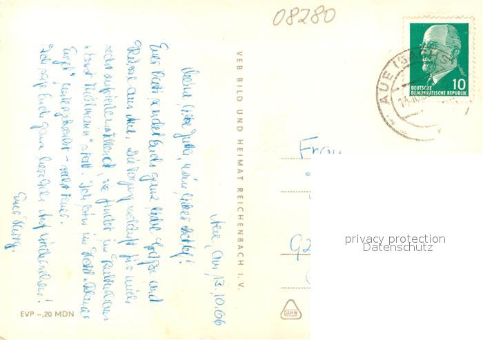 73593313 alte Postkarte Aue Sachsen Stadtpanorama Kulturhaus Ernst Thaelmann Polytechnische Oberschule Karl Marx Bruecke HO Hotel Blauer Engel postalisch gelaufen Erhaltung siehe scans [FriedD77] KatCode: 11110014191040