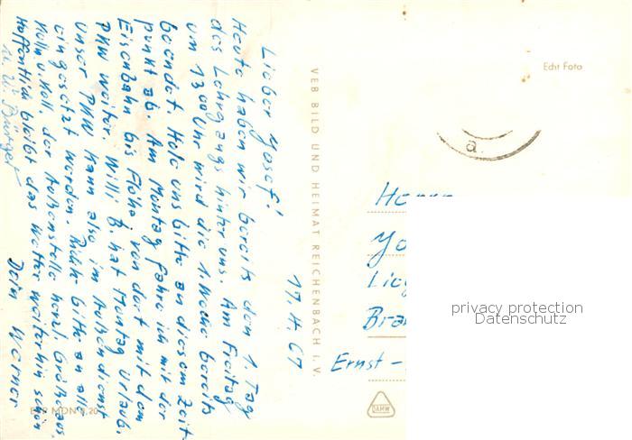 73873809 alte Postkarte Aue Sachsen Teilansicht karl Marx Bruecke Kulturhaus Ernst Thaelmann Polytechnische Obrschule HO Hotel Blauer Engel postalisch gelaufen Erhaltung siehe scans [WerneD78] KatCode: 11110014191040