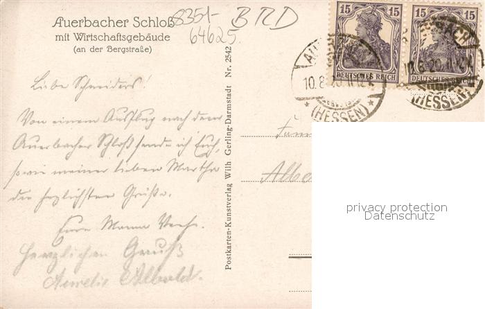 73573072 alte Postkarte Auerbach Bergstrasse Auerbacher Schloss mit Wirtschaftsgebaeude Kuenstlerkarte postalisch gelaufen Erhaltung siehe scans [FriedD77] KatCode: 11110006431002