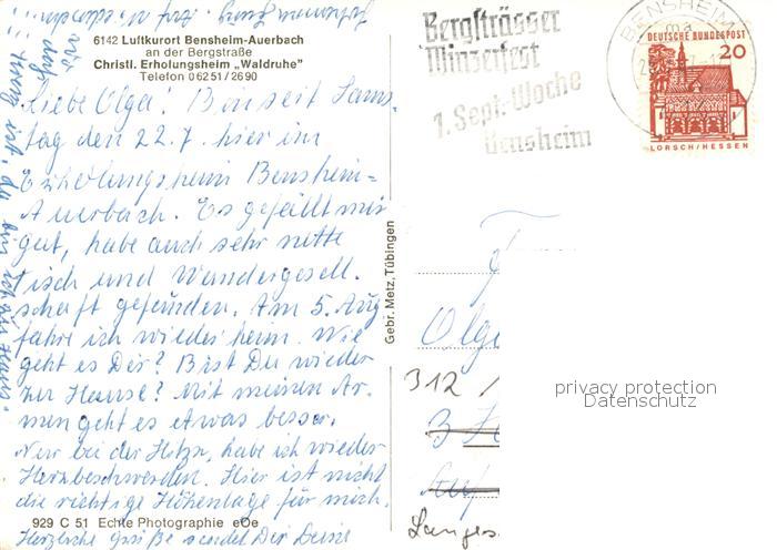 73121606 alte Postkarte Auerbach Bergstrasse Christliches Erholungsheim Waldruhe postalisch gelaufen Erhaltung siehe scans [KathaD81] KatCode: 11110006431002