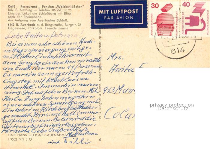 73569977 alte Postkarte Auerbach Bergstrasse Waldschloesschen Cafe Restaurant Terrasse Gastraum Schloss postalisch gelaufen Erhaltung siehe scans [WerneD78] KatCode: 11110006431002
