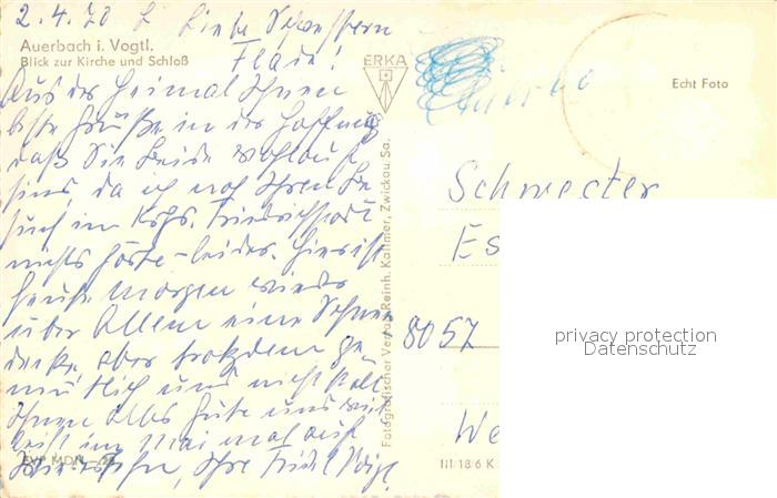 72640550 alte Postkarte Auerbach Vogtland Kirche Schloss postalisch gelaufen Erhaltung siehe scans [NatalD47] KatCode: 11110014178030