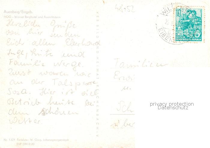 73797083 alte Postkarte Auersberg Wildenthal Erzgebirgskreis HOG Wismut Berghotel und Aussichtsturm postalisch gelaufen Erhaltung siehe scans [WerneD78] KatCode: 11110014191120