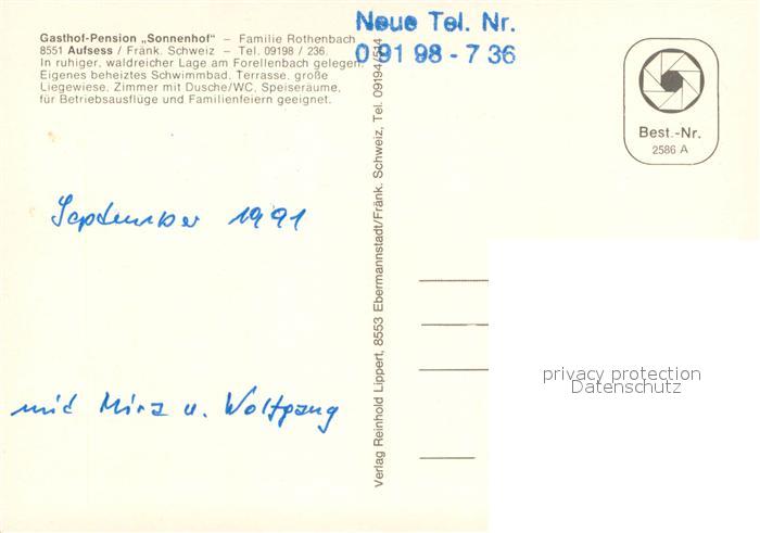 73654716 Aufsess Gasthof Pension Sonnenhof postalisch nicht gelaufen Erhaltung siehe scans [FriedD77] KatCode: 11110009472115