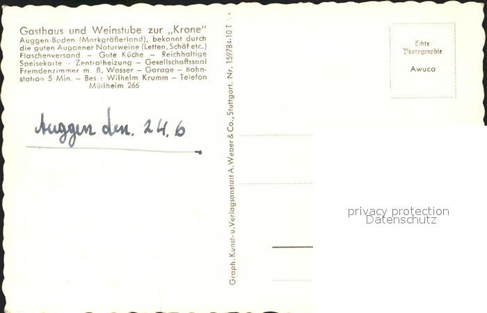 31705942 Auggen Gasthaus und Weinstube zur Krone postalisch nicht gelaufen Erhaltung siehe scans KatCode: 11110008315004