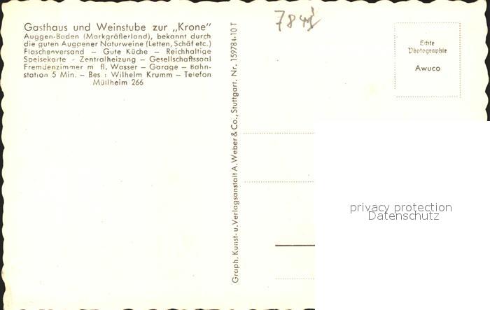 31734607 Auggen Gasthaus Weinstube zur Krone postalisch nicht gelaufen Erhaltung siehe scans KatCode: 11110008315004