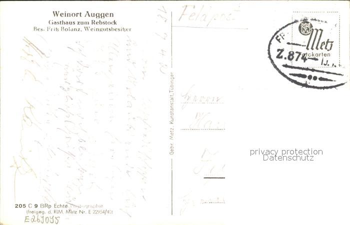 31704379 alte Postkarte Auggen Weinort Gasthaus zum Rebstock postalisch gelaufen Feldpost Erhaltung siehe scans KatCode: 11110008315004