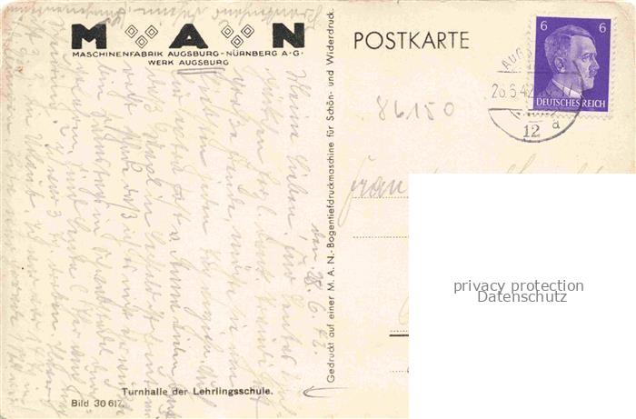 74059640 AUGSBURG CITY MAN Maschinenfabrik Augsburg-Nuernberg AG Turnhalle der Lehrlingsschule postalisch gelaufen Erhaltung siehe scans [FriedD77] alte Postkarte Frie Katcode 11110009761000