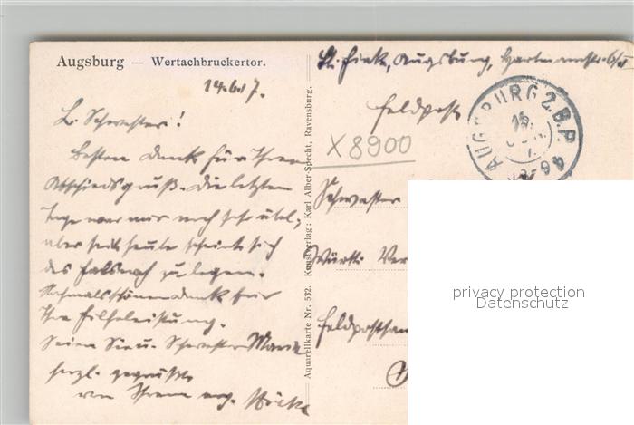 42971618 AUGSBURG CITY Wertachbruckertor postalisch gelaufen Feldpost Erhaltung siehe scans [AndreD76] Feldpost alte Postkarte Andr Katcode 11110009761000