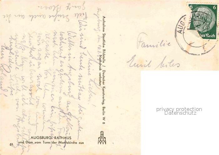 72694745 alte Postkarte Augsburg Dom vom Turm der Moritzkirche aus gesehen postalisch gelaufen Erhaltung siehe scans [LiesaD40] KatCode: 11110009761000