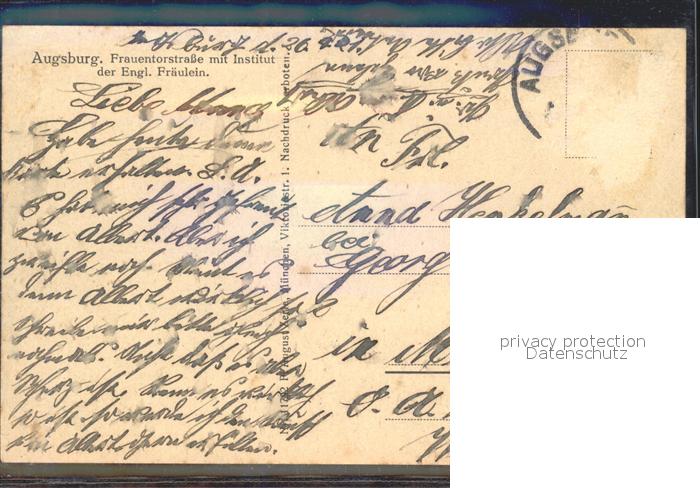 72148596 alte Postkarte Augsburg Frauentorstrasse Institut Engl Fraeulein postalisch gelaufen Erhaltung siehe scans KatCode: 11110009761000