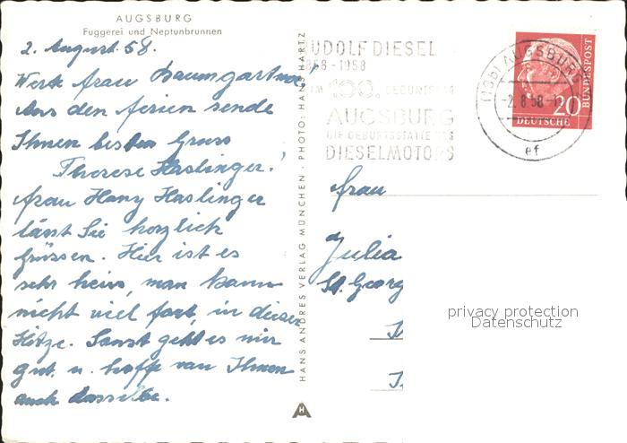 72314996 alte Postkarte Augsburg Fuggerei und Neptunbrunnen postalisch gelaufen Erhaltung siehe scans KatCode: 11110009761000