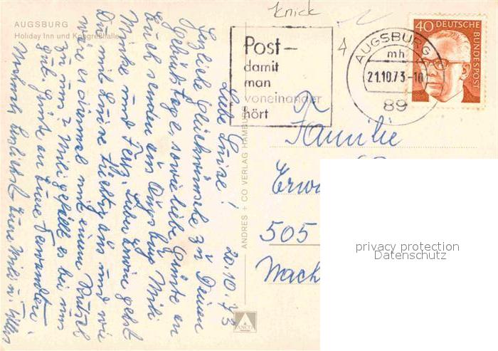 72824492 alte Postkarte Augsburg Holiday Inn und Kongresshalle postalisch gelaufen Erhaltung siehe scans [FriedD77] KatCode: 11110009761000