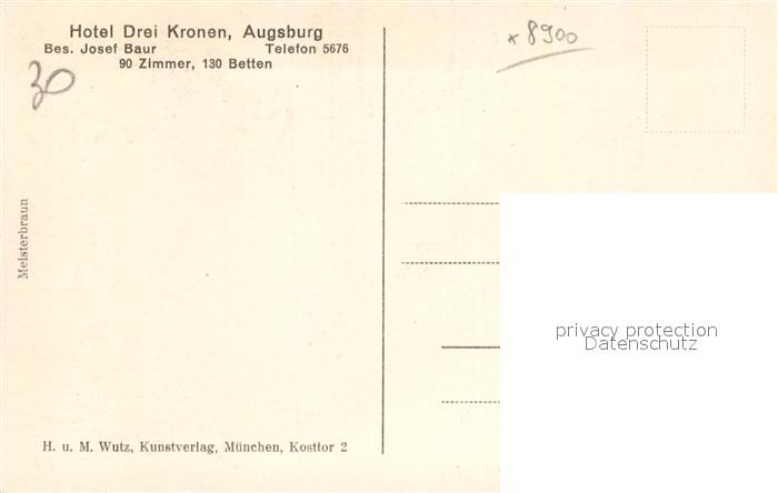 42970585 Augsburg Hotel drei Kronen postalisch nicht gelaufen Erhaltung siehe scans [AndreD76] KatCode: 11110009761000