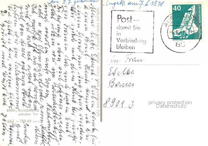 72706952 alte Postkarte Augsburg Jakober Tor postalisch gelaufen Erhaltung siehe scans [AndreD76] KatCode: 11110009761000