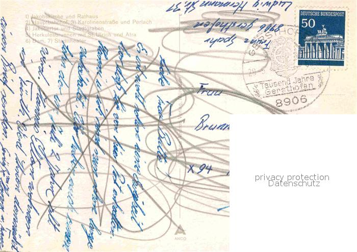72707846 alte Postkarte Augsburg Jakobskirche Rathaus Hauptbahnhof Jakobertor Stadtgraben Herkulesbrunnen Dom Stadttheater postalisch gelaufen Erhaltung siehe scans [WerneD78] KatCode: 11110009761000