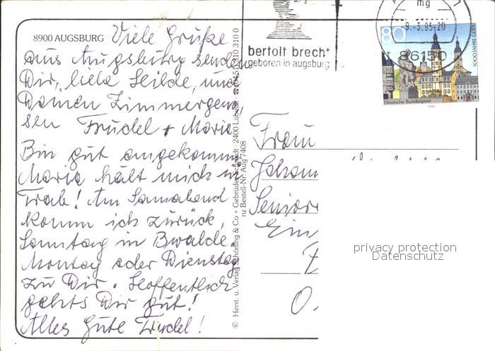 72370698 alte Postkarte Augsburg Kirche Rathaus Perlachturm Brunnen Weberhaus Fronhof Turm Tor Platz Fuggerpalast Theater Freilichtbuehne Kongresshalle Fuggerei Bahnhof Wildwasser Kanu postalisch gelaufen Erhaltung siehe scans KatCode: 11110009761000