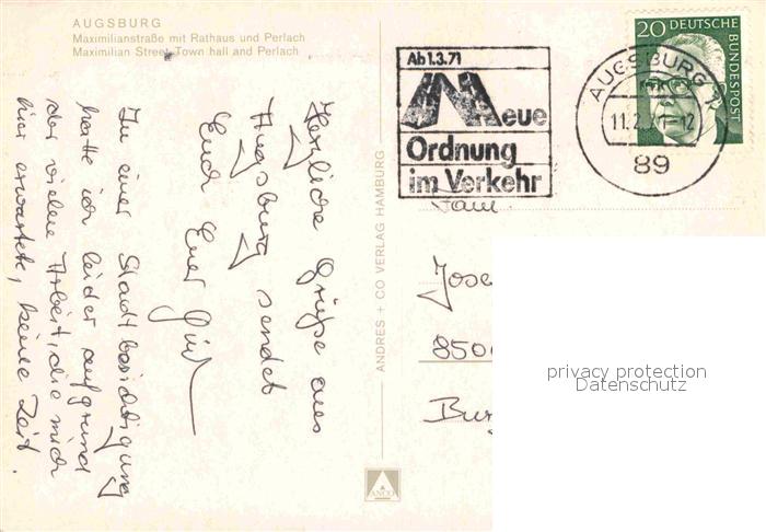 72707284 alte Postkarte Augsburg Maximilianstr mit Rathaus und Perlach postalisch gelaufen Erhaltung siehe scans [WerneD78] KatCode: 11110009761000