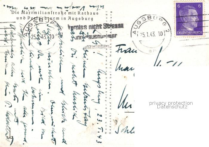 73551269 alte Postkarte Augsburg Maximilianstrasse mit Rathaus und Perlachturm postalisch gelaufen Erhaltung siehe scans [WerneD78] KatCode: 11110009761000